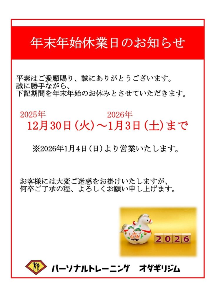 年末年始休業のお知らせです。